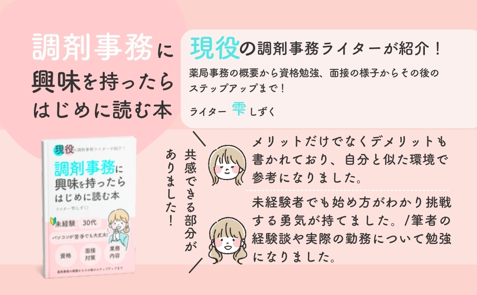 こんにちは、ライフハックBiz編集部です。 この度、「調剤事務に興味を持ったらはじめに読む本」が電子書籍で発売されました! この本は、ライターの雫(しずく)さんの初の著書です。 30代、未経験、パソコンが苦手な雫さんでしたが、調剤事務の仕事を知... -